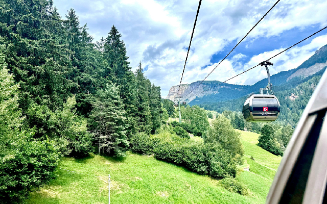 最近距離接觸藍柯弗爾山峰的纜車,也是造型最有趣的纜車,垂直的吊掛的白色車廂,有如膠囊般,裡面只能容納兩個乘客,由站務人員細心指導下,跑帶跳上纜車,纜車來到山壁時以65度角望山峰爬升,山壁上健行、攀岩的人群清晰可見。