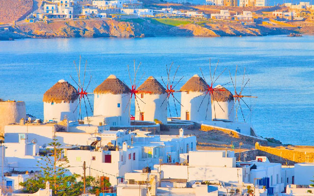 在愛琴海湛藍的懷抱中,米克諾斯島如夢幻畫作。風車隨海風旋轉,白牆藍窗映襯碧海,陽光灑下金光,宛如電影場景。隨著ABBA的輕快音符,彷彿置身《媽媽咪呀!》的歡樂情境,踏上島嶼即刻融入浪漫與自由。
