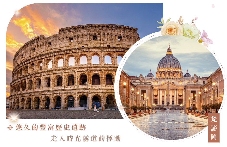 義大利的首都,更是兩千多年的羅馬帝國心臟,悠久的豐富歷史遺跡令人驚嘆。羅馬的千年歷史風華,萬神殿、競技場、拱門圓柱,帶您走入時光隧道的悸動。