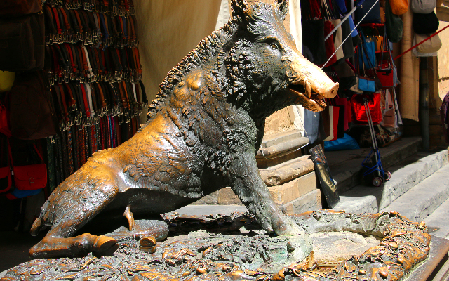 金豬噴泉位於佛羅倫斯新市場,為巴洛克大師塔卡所鑄,傳說是安徒生童話《銅豬》的原型。銅豬張口吐水,模樣生動可愛。相傳只要摸摸豬鼻子,並將硬幣從豬口投入水盆內成功掉出,便能重返佛羅倫斯。這座可愛噴泉吸引無數遊客駐足合影,是寓意吉祥的祈願小景點。