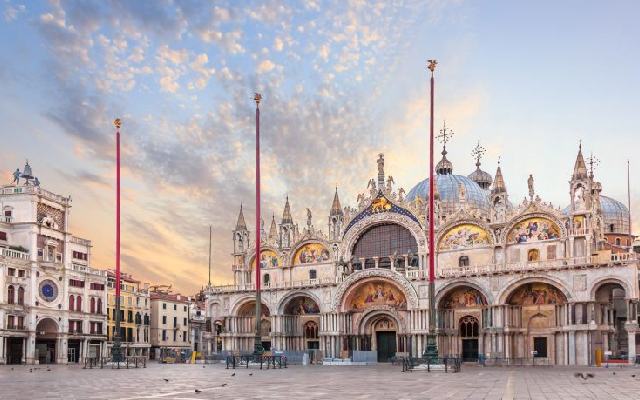 威尼斯代表性宗教建築,融合拜占庭風格與東西方藝術,氣勢恢弘、華麗非凡。9世紀為供奉聖馬可遺體而建,曾為總督專屬教堂,象徵政教合一的輝煌時代。外觀金碧輝煌、雕飾細緻,穹頂描繪壯麗聖經場景,是信仰與藝術結合的經典傑作。