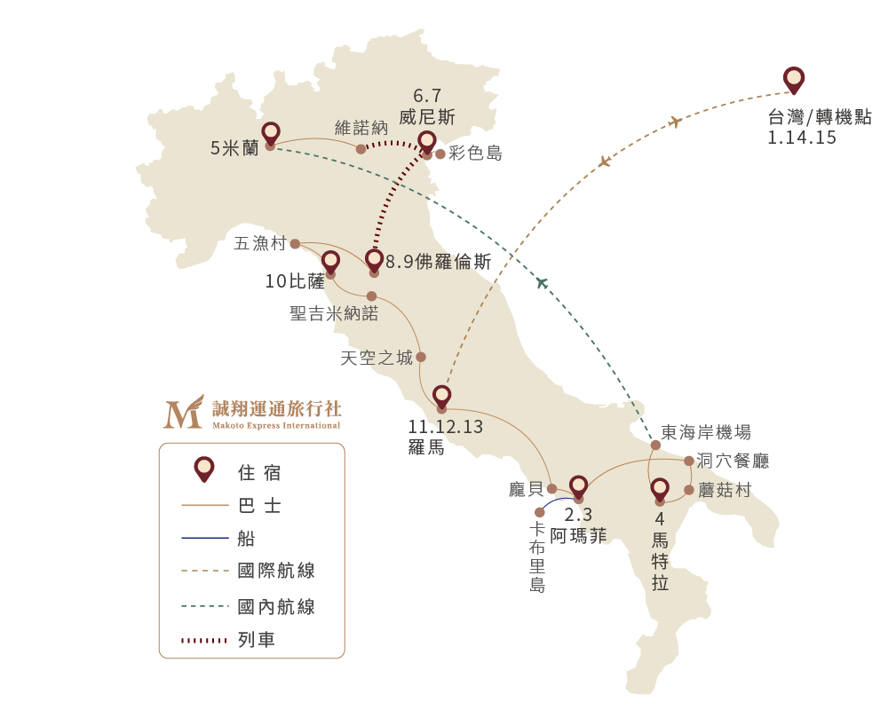 華航直飛+一段國內飛機+兩段快速火車快速串連南北義、最美海岸線:南阿瑪菲+北五漁村、東岸世界遺產:馬特拉+蘑菇村、玩美三島:卡布里島+彩色島+威尼斯島、托斯坎尼山城:聖吉米納諾、天空之城、三大主題舒適連泊:威尼斯+佛羅倫斯+羅馬3晚、馬特拉&比薩兩晚特色五星飯店、龍蝦麵、丁骨牛排、墨魚麵、世界十大最浪漫洞穴餐廳&米其林星級饗宴