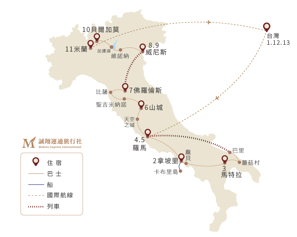 羅馬進/米蘭出、雙航點進出不走回頭路,雙段快速火車,優雅旅行 深度南義:龐貝+卡布里島、托斯坎尼最美雙城:聖吉米納諾+天空之城、愛情之都維若納、世界七大奇景比薩斜塔、全程無自理餐、義大利在地美味:丁骨牛排+牛肝菌麵+墨魚麵+烤龍蝦+三星米其林饗宴、全程四星精選旅店。四大主題連泊:拿坡里、羅馬、佛羅倫斯、威尼斯