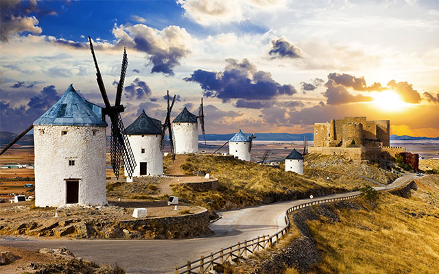 拉曼徹是西班牙中部裸露高原上的一個小村鎮,也是文豪塞萬提斯筆下唐吉軻德的異想世界。一望無際的大地美景,搭配佇立山丘超過400年的白色風車,完全保持了小說「唐吉軻德」中所描述的風景,讓我們一起在風車村中尋找傳說中的唐吉軻德騎士足跡吧!