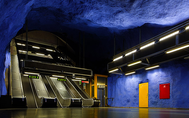 被稱為世界最長的藝術館,斯德哥爾摩的地鐵滿一站都有不同的特色與創作,被公認最美的T.Centralen站。藍白色季的牆面繪滿交錯樹葉,未經修飾的基石牆面加上特殊的照明效果,讓人彷彿置身在前衛又原始的自然洞穴中。