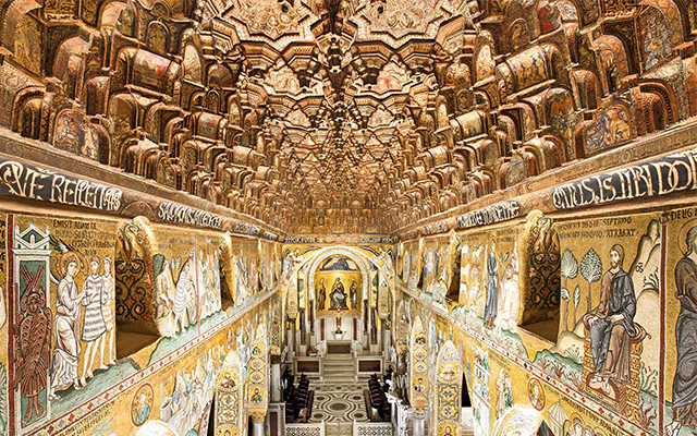 西西里島首府巴雷摩宏偉的諾曼名勝王室山,蒙雷阿萊大教堂是當今現存世界上最傑出的諾曼式建築之一,欣賞西西里和拜占庭藝術家,精雕細琢金光閃閃的馬賽克鑲嵌畫,由諾曼國王威廉二世,為了和巴勒摩大主教勢力抗衡所建。