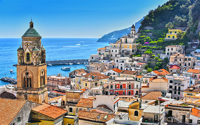阿瑪菲海岸主要城市-阿瑪菲鎮,跟威尼斯、熱那亞等城市於10至11世紀共同組成海運共和國,當時因強大航海勢力而強盛,後期被比薩所取代。整個城市座落於山坡上的一個深谷谷口,前有翠綠海灣,後有檸檬園,被壯觀的懸崖及海岸景色包圍。
