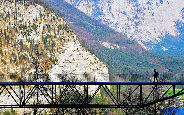 傳統民宅沿著湖岸山壁而建,寧靜幽美,觸目所及盡是如詩如畫。搭乘纜車登上海拔835公尺高度的車站,散步前往天空步道,由高處鳥瞰哈斯塔特欣賞一覽無遺的湖區美景。【如遇斜坡纜車維修或關閉停駛,將退回每人15歐元】