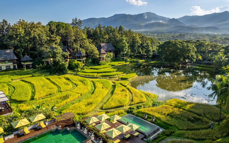 酒店靜臥於寧靜的湄林谷地,四周被稻田環繞,景致清幽如畫,展現蘭納文化的樸實優雅。傳統泰式建築融合自然景觀,營造出深具療癒感的氛圍,讓每位賓客在自然、文化與靜謐之中,感受身心靈的和諧共鳴。