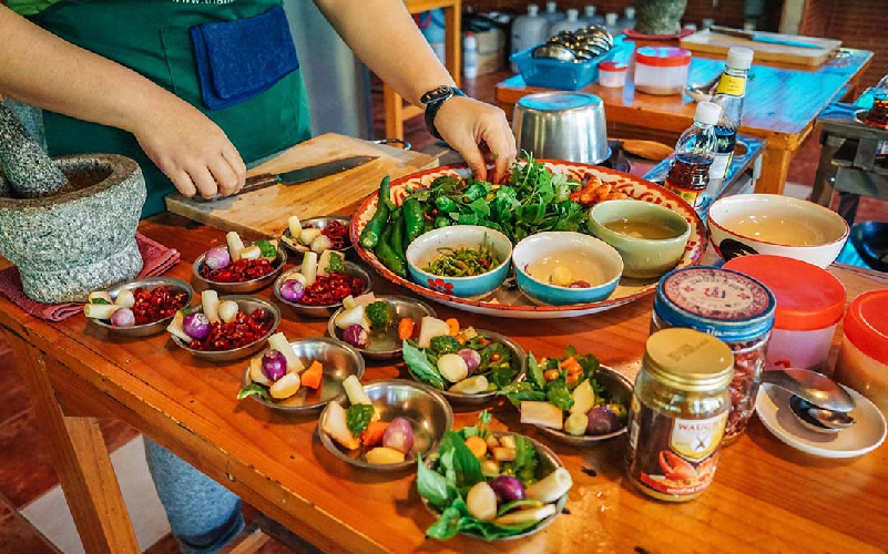 從採集香草開始,一場沉浸式料理體驗即將展開。穿上圍裙與斗笠,走進自家有機農園親手採收香料,再回到露天廚房,由中英雙語廚師帶領烹調多道泰式料理。過程中趣味十足、無壓力,讓人輕鬆愛上做菜的成就感與香氣。