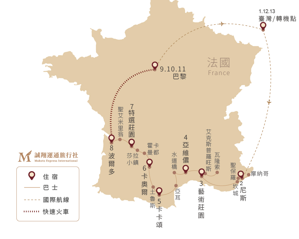 阿聯酋、尼斯進巴黎出、不走回頭路、TGV子彈列車連接南北最輕鬆 普羅旺斯藝術莊園名家建築藝術、山居歲月普羅旺斯、蔚藍海岸與時尚摩納哥、古城卡卡頌、多敦聶河谷、波爾多葡萄酒鄉,全程美味法式料理、二星米其林饗宴、LE7葡萄酒博物館景觀餐廳、藍火車餐廳、巴黎鐵塔景觀餐廳、塞納河遊船晚宴、巴黎文華東方奢華連泊三晚