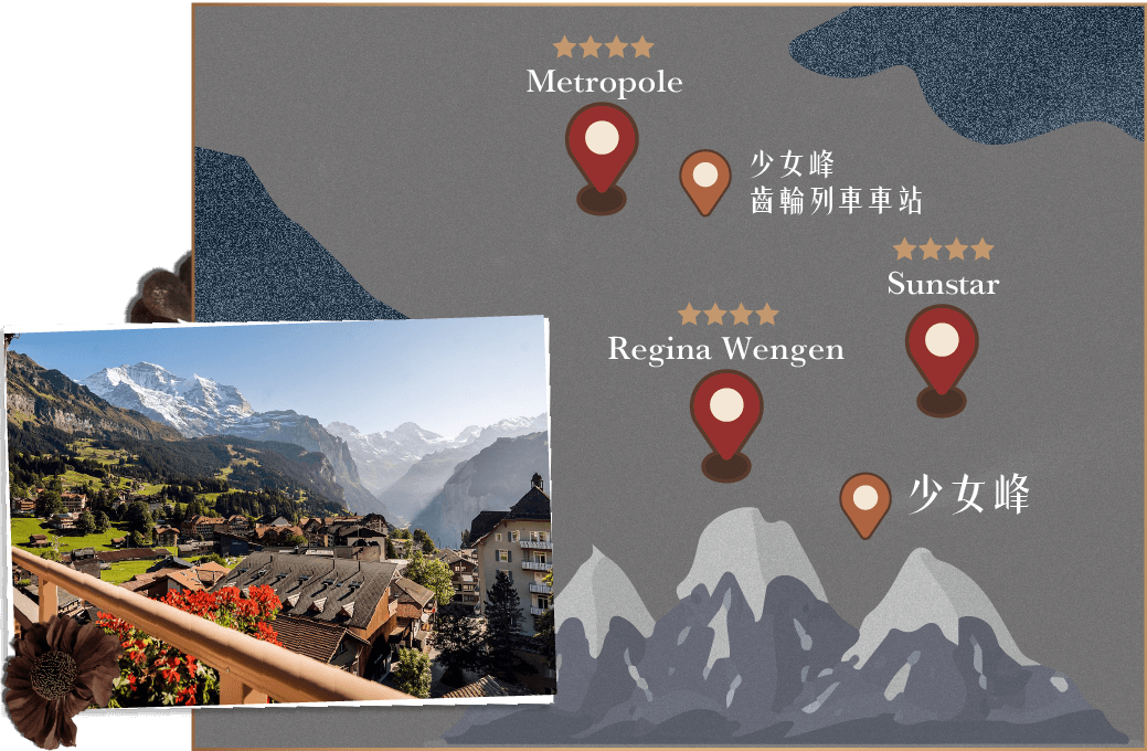 - 三大瑞士名峰:少女峰+馬特洪峰+白朗峰