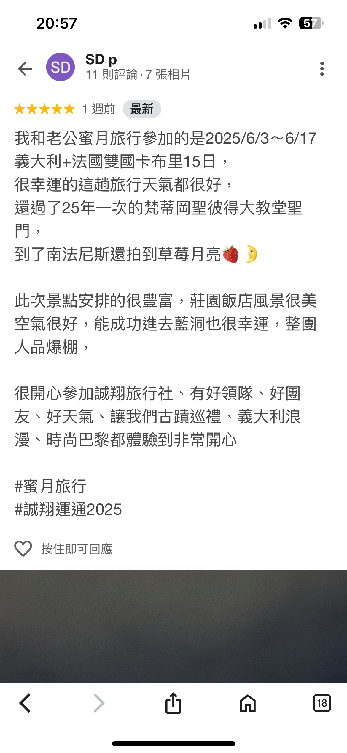 一生一次的蜜月旅行,我們選擇誠翔運通的義法14日行程,從羅馬出發一路玩到巴黎,每站都有驚喜與感動。漫步威尼斯、品味普羅旺斯薰衣草、在巴黎留下無數浪漫合照。感謝領隊Gina與業務魏魏的用心,讓旅程順利又溫馨。推薦給想留下美好回憶的新婚夫妻!