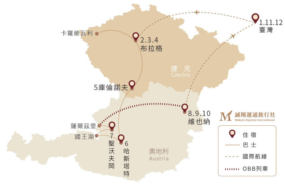 華航雙點進出、夢幻三湖、市場獨家首創維也納藝術雙宮:貝爾維帝宮+熊布朗宮 波希米亞童話小鎮、薩爾茲卡瑪古湖區、真善美音樂之都、布拉格古董車&快捷火車頭等艙 市場獨家兩大主題連泊三晚:布拉格+維也納五星飯店、奧捷道地美食、二星米其林饗宴