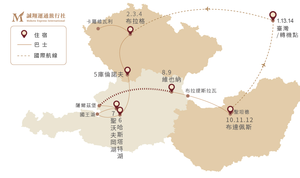 阿聯酋航空雙點進出、夢幻湖區、市場首創維也納藝術雙宮:貝爾維帝宮+熊布朗宮 波希米亞童話小鎮、薩爾茲卡瑪古湖區、真善美音樂之都、布拉格古董車體驗、多瑙河圓舞曲、聖坦德藝術小鎮、市場獨家三大主題五星連泊:布拉格+維也納+布達佩斯、奧捷匈在地美味、探索世界最美紐約咖啡館