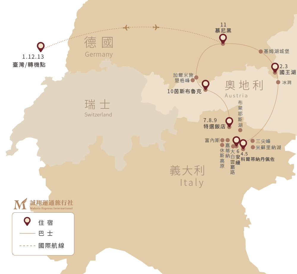 慕尼黑往返、深度遊覽國王湖上下湖區、西多洛米堤刀鋒山+休斯高原+富內斯山谷、北多洛米提布萊耶斯藍湖+探索山巔藝術秘境、東多洛米提米蘇里娜湖+索拉皮斯湖+三尖峰+五塔峰+大白雲巖公路+藍科弗爾山、阿爾卑斯名城茵斯布魯克+加爾米施、德國楚格峰、米其林推薦料理、國王湖連泊兩晚、多洛米堤特選飯店三連泊、全程五星飯店、安縵酒店一晚