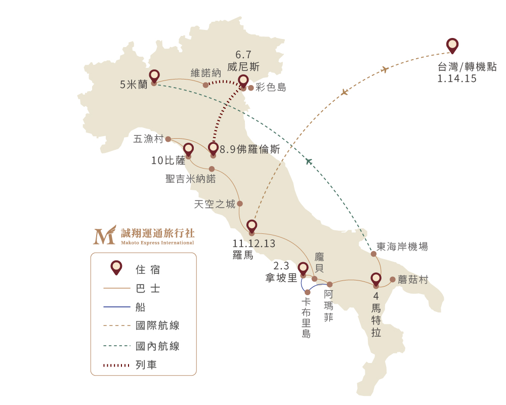 阿聯酋A380奢華起航+一段國內飛機+兩段快速火車快速串連南北義、最美海岸線:南阿瑪菲+北五漁村、東岸世界遺產:馬特拉+蘑菇村、玩美三島:卡布里島+彩色島+威尼斯島、托斯坎尼山城:聖吉米納諾、天空之城、三大主題舒適連泊:威尼斯+佛羅倫斯+羅馬3晚、馬特拉&比薩兩晚特色五星飯店、龍蝦麵、丁骨牛排、墨魚麵、三星米其林饗宴
