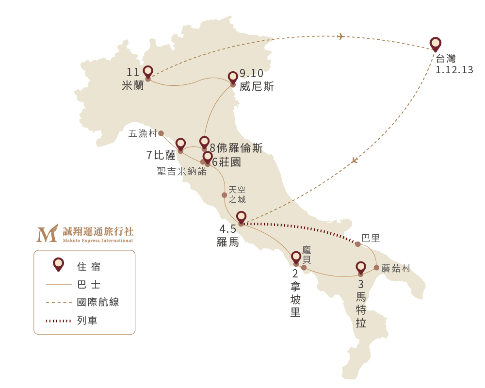 阿聯酋雙點進出、羅馬進/米蘭出、不走回頭路+一段快速火車快速連接 漫遊南義:馬特拉+蘑菇村+龐貝古城、托斯坎尼最美雙城:聖吉米納諾+天空之城、七大奇景比薩斜塔、五漁村、四大經典古城-羅馬、威尼斯、佛羅倫斯、米蘭、全程四星優選旅宿 三星米其林饗宴、在地風味料理:丁骨牛排+牛肝菌燉飯+墨魚麵+龍蝦麵