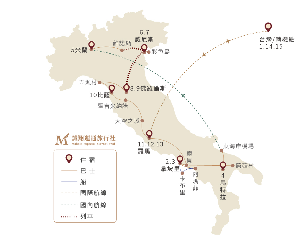阿聯酋A380奢華起航+一段國內飛機+兩段快速火車快速串連南北義、最美海岸線:南阿瑪菲+北五漁村、東岸世界遺產:馬特拉+蘑菇村、玩美三島:卡布里島+彩色島+威尼斯島、托斯坎尼山城:聖吉米納諾、天空之城、四大主題舒適連泊:拿坡里+威尼斯+佛羅倫斯+羅馬3晚、馬特拉&比薩兩晚特色五星飯店、龍蝦麵、丁骨牛排、墨魚麵、三星米其林饗宴