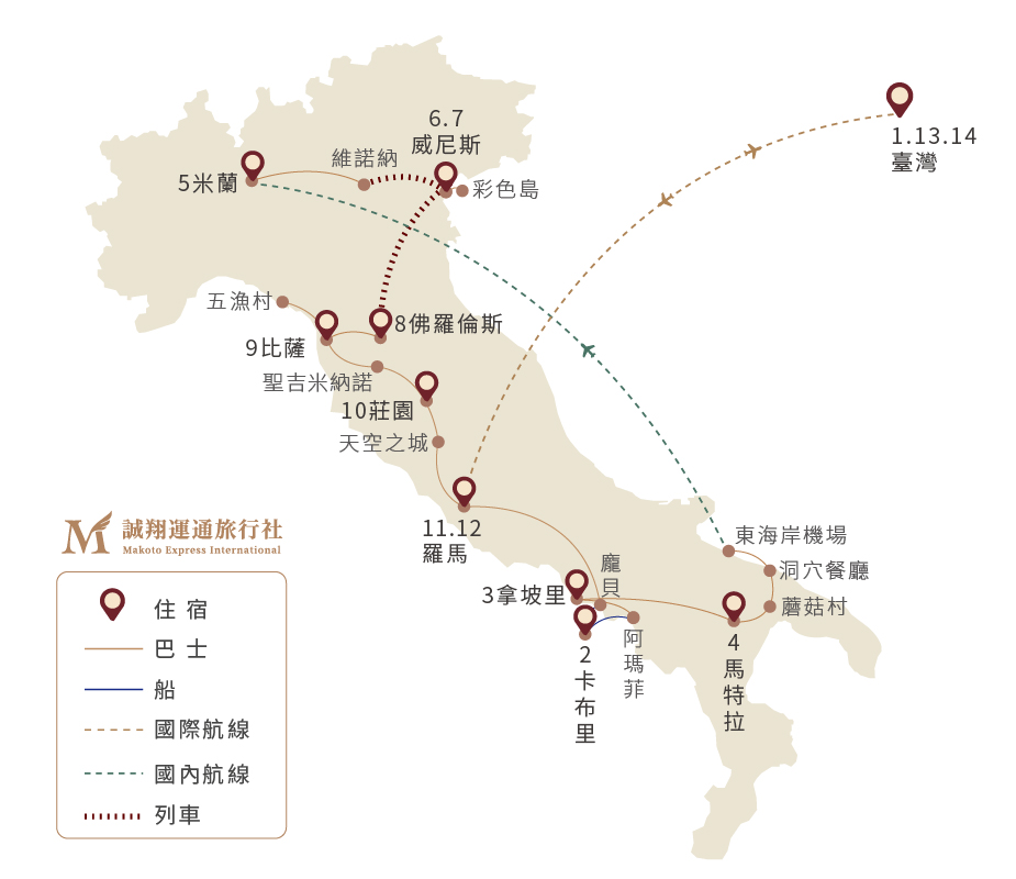華航直飛+一段國內飛機+兩段快速火車快速串連南北義、最美海岸線:南阿瑪菲+北五漁村、東岸世界遺產:馬特拉+蘑菇村、玩美三島:卡布里島+彩色島+威尼斯島、托斯坎尼山城:聖吉米納諾、天空之城、兩大主題舒適連泊:威尼斯+羅馬、馬特拉+比薩兩晚特色五星飯店、龍蝦麵、丁骨牛排、墨魚麵、世界十大最浪漫洞穴餐廳、米其林星級饗宴