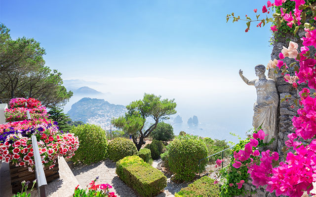 位於蘇連多半島外、面積約10平方公里的卡布里島,以壯麗海景與藍洞奇景聞名。盛夏時節,藍天白雲下,鮮花盛開、海水碧藍,島上別墅林立、巷弄蜿蜒,洋溢濃厚地中海風情。這座夢幻島嶼曾吸引羅馬皇帝提比略隱居,也是今日明星名流熱愛的度假天堂。