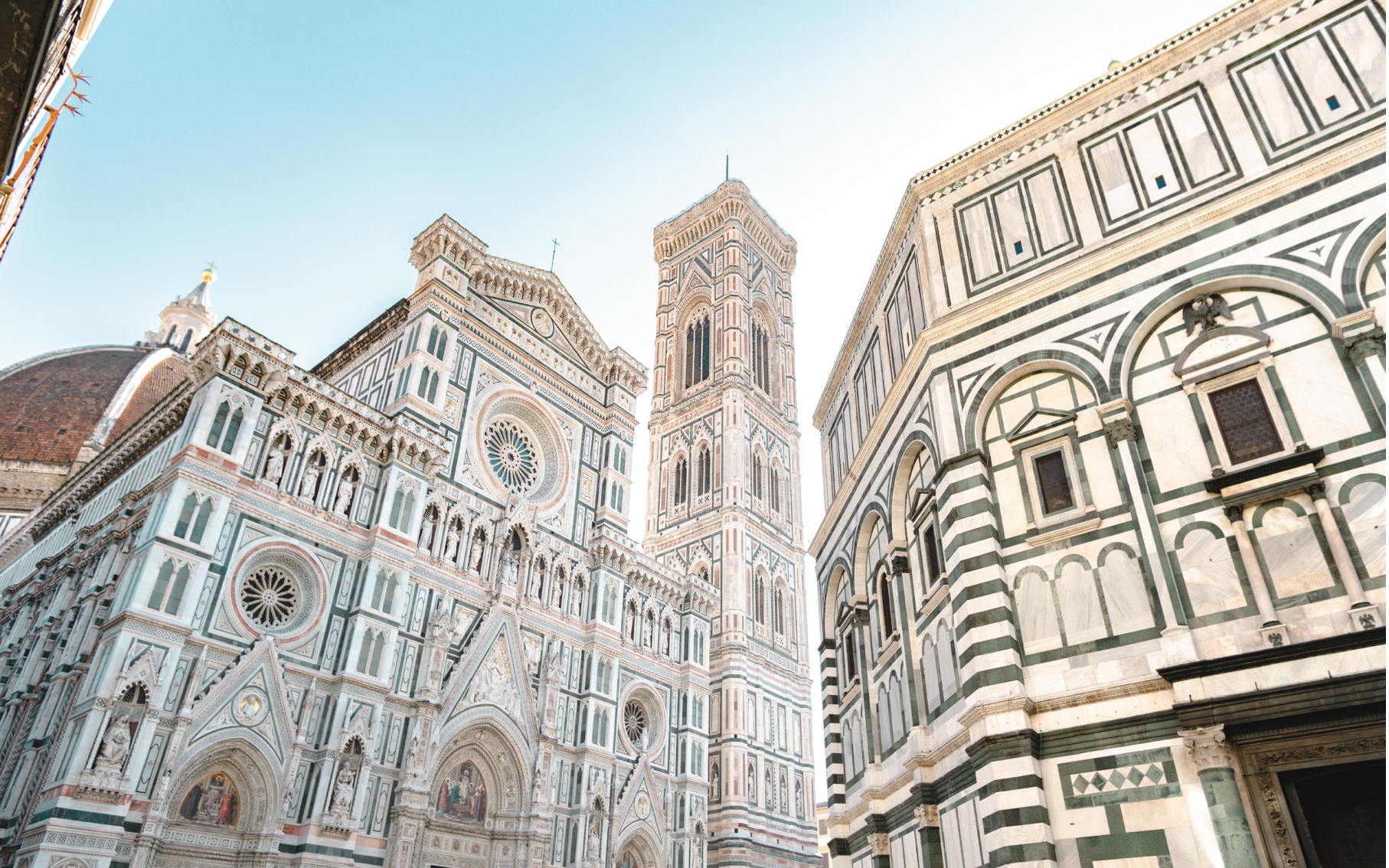 是哥德式建築代表作,最大特色為由布魯涅斯基設計的巨大紅磚穹頂。外牆由三色大理石砌成,色彩斑斕、風格獨具。整體建築群包括教堂本體、八角形洗禮堂、82公尺高的喬托鐘樓。其壯麗與工藝之美被聯合國教科文組織列為世界遺產,是佛羅倫斯最知名地標。