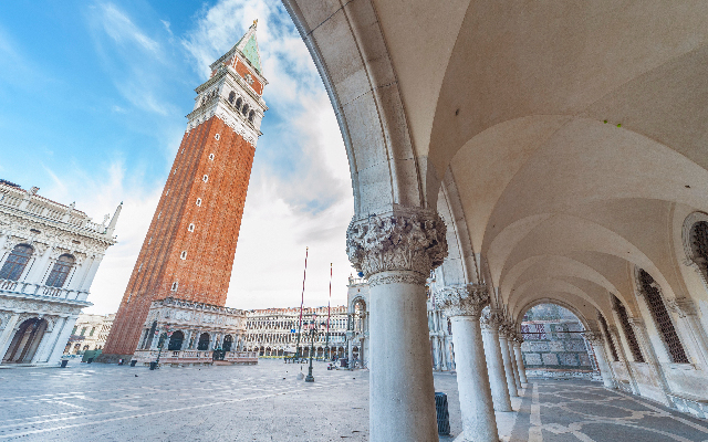 矗立於聖馬可廣場一隅,威尼斯鐘樓高約99米,是城市天際線中最具辨識度的地標。最早為碼頭的瞭望臺,經歷1902年倒塌後於原址重建,延續百年風華。在廣場悠然漫步,仰望這座紅磚與金頂交織的歷史象徵,感受鐘聲迴盪於水都的獨特韻味。