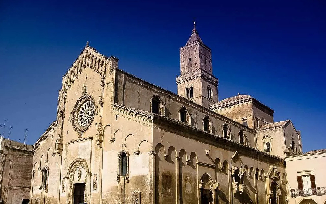 主教座堂是馬特拉的標誌性建築,也是聯合國世界文化遺產。從教堂頂部可以俯瞰馬特拉古城全景,景色十分壯觀。教堂外觀樸實無華,正面門坊鑲著16瓣的玫瑰窗裝飾。內部則富麗堂皇,有精美的壁畫和雕塑。