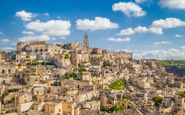 為義大利最古老且獨特的城市之一,以喀斯特山谷間的沙西石屋建築群聞名。這些原始石屋為早期穴居人所鑿建,層層堆疊、錯落有致,彷彿時光靜止的山城。古城分為南北兩區,漫步其間,彷彿置身聖經時代的耶路撒冷場景,極具歷史氛圍與宗教意象,被列為世界遺產。