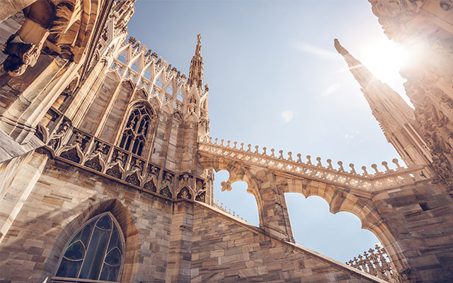 歐洲第三大的米蘭大教堂,從始建到建成共花費六個世紀,整體建築風格融合古典與哥德式,也是世界最大哥德式建築經典。外觀由白色大理石砌成,上半部為哥德式尖塔,共計138座。下半部為典型巴洛克式,從上而下佈滿精美雕塑,是文藝復興時期具代表性的建築。