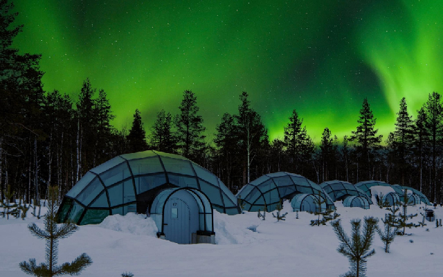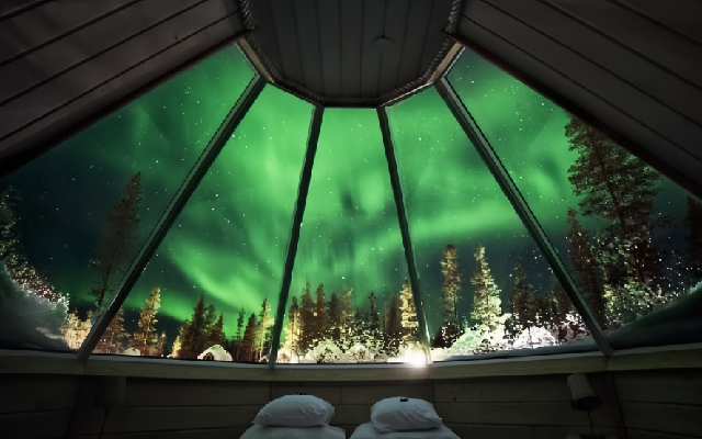 芬蘭最具代表性的玻璃圓頂小屋,擁有半球形設計與270度透明視野,無須踏出室外,即可在暖氣十足的空間中仰望極光。每間Igloo皆設有獨立衛浴與暖床設施,兼顧浪漫與舒適,地點座落於拉普蘭森林區域,極光能見度極高,是芬蘭最具代表性的住宿之一。