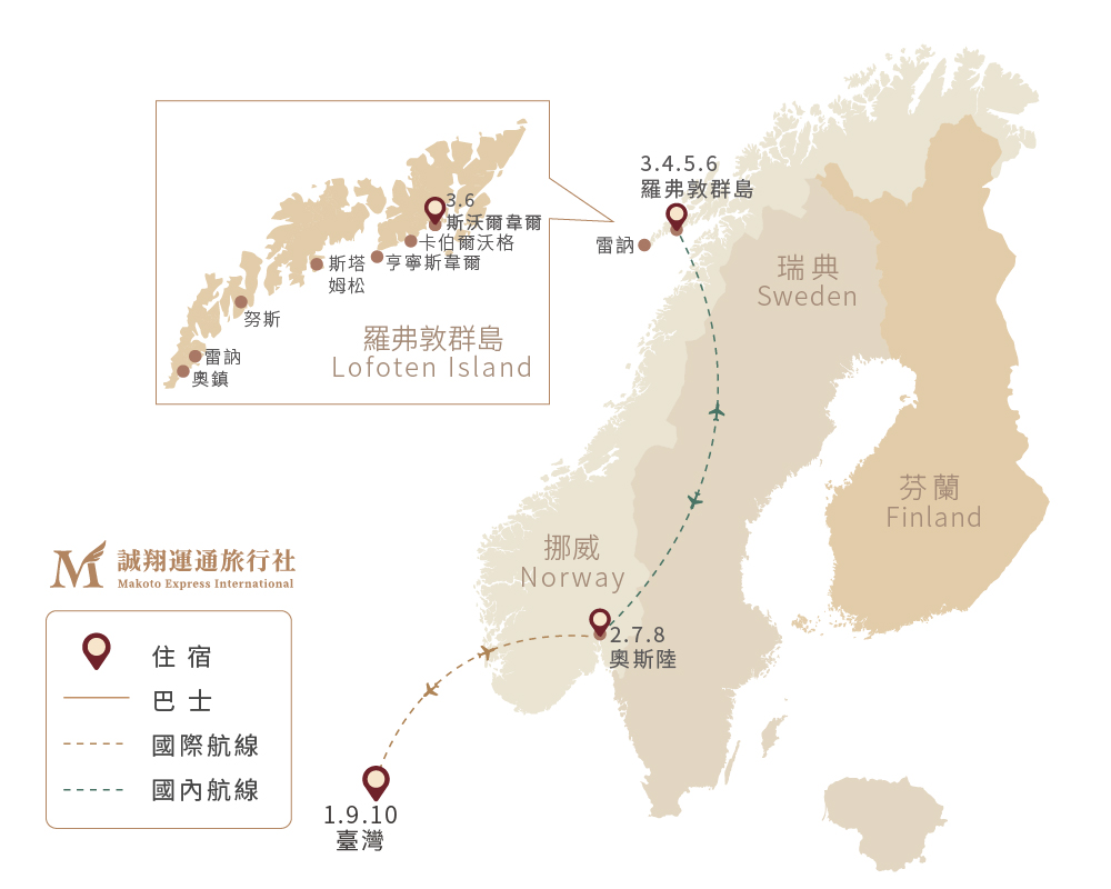 泰航奧斯陸來回、兩段內陸段飛機高效銜接、五天四夜連續追光、羅弗敦群島深度巡禮、極光遊船與海鷹狩獵雙體驗、下榻北極圈特色景觀飯店、奧斯陸孟克藝術饗宴