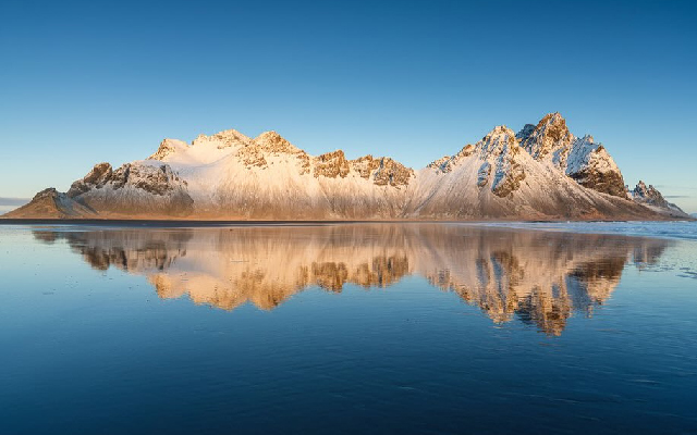 位於冰島東南角的蝙蝠山,山勢銳利峻峭,形似振翅而飛的巨型蝙蝠,腳下則是細膩綿延的黑沙灘。退潮時,水面如鏡,將山影、雲層與天光一併映入,如夢似幻。若天氣晴朗、風平浪靜,就能幸運看見如幻境般的對稱美景,讓人駐足難忘。
