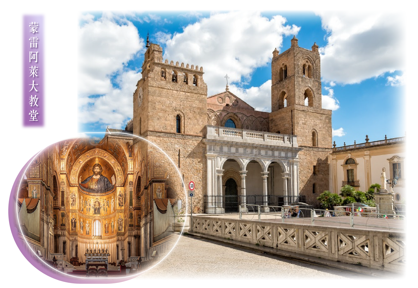 距離巴勒摩僅數公里,坐落於山腰的蒙雷阿萊,以金光閃耀的主教座堂聞名。教堂內部的馬賽克藝術細膩而震撼,被視為拜占庭藝術的巔峰之作。