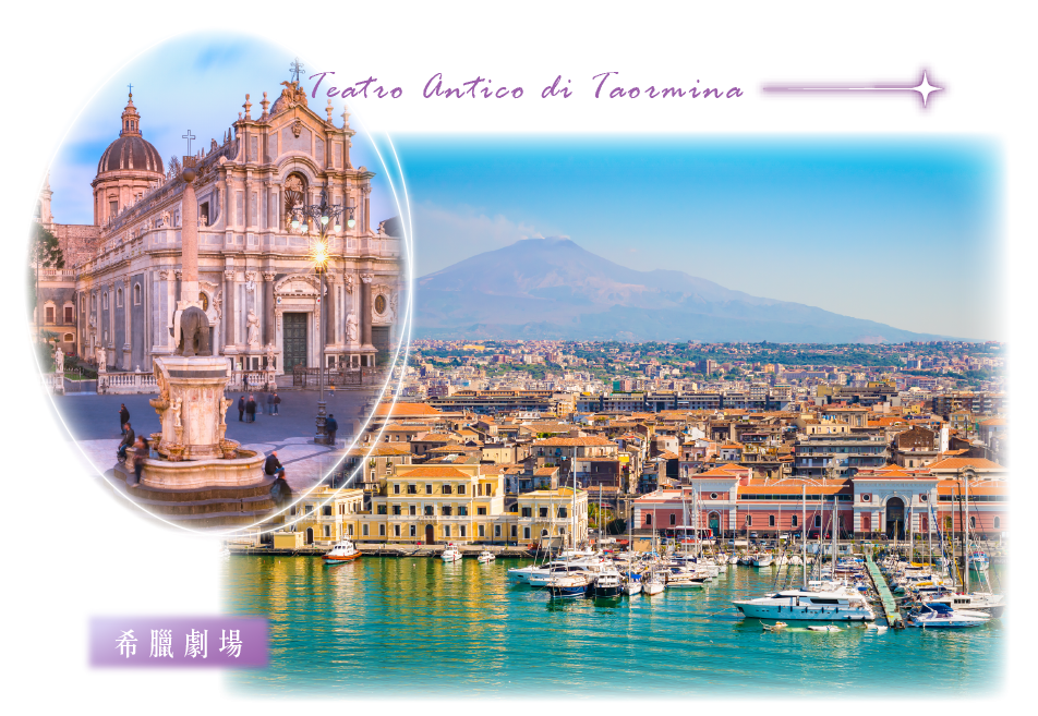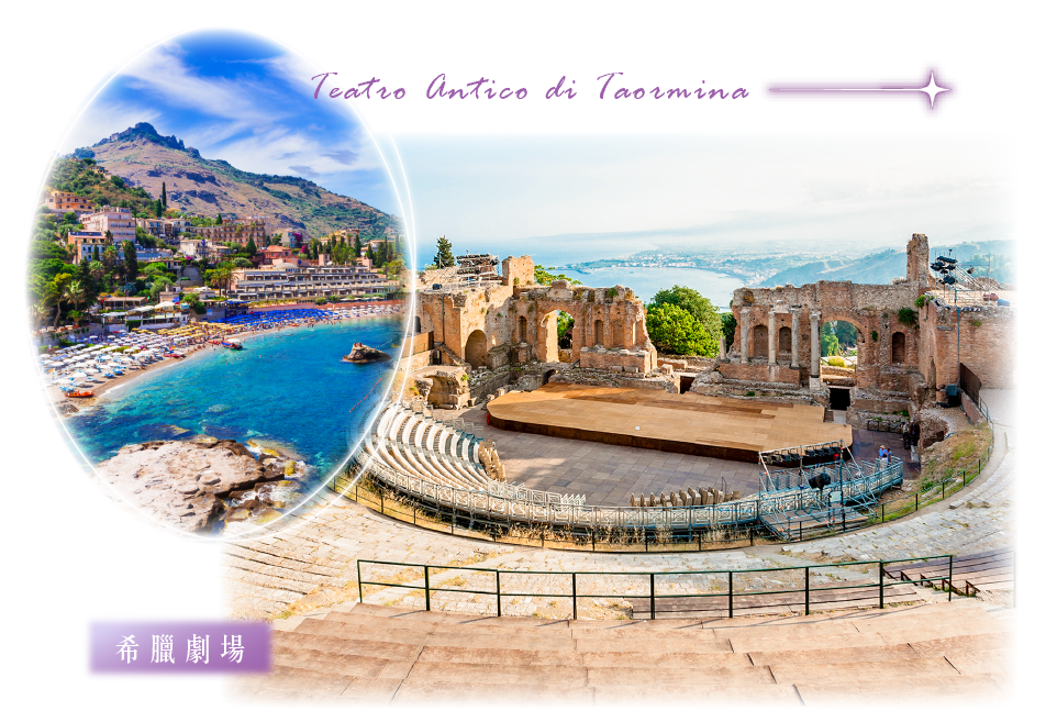 最著名的希臘劇場坐落在半山腰,可遠眺海洋與艾特納火山,被譽為「世界景色最美的劇場之一」。