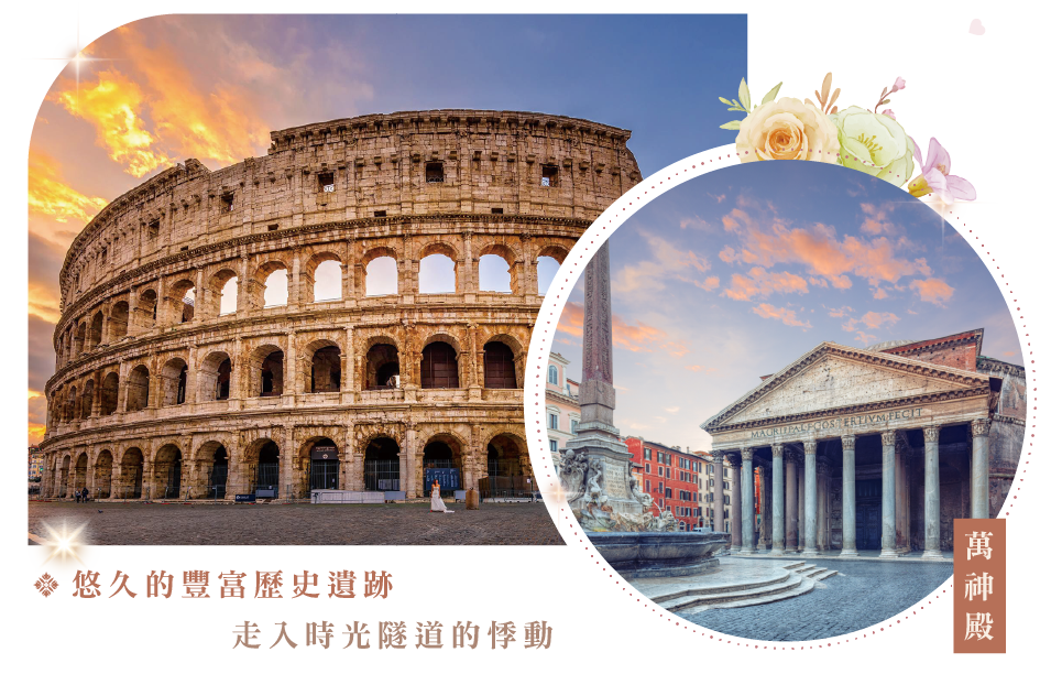 義大利的首都,更是兩千多年的羅馬帝國心臟,悠久的豐富歷史遺跡令人驚嘆。羅馬的千年歷史風華,萬神殿、競技場、拱門圓柱,帶您走入時光隧道的悸動。