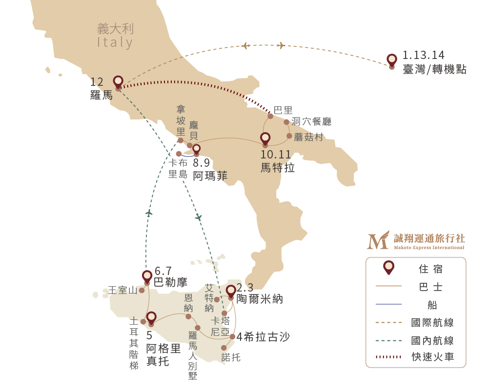華航直飛+兩段國內段班機+一段火車,最短搭車距離 震撼的希臘+羅馬千年文化遺址:阿格里真托希臘神殿+羅馬人別墅馬賽克藝術、陶爾米納希臘劇場;美麗巴洛克城市建築美學希拉古沙、奇特大自然體驗艾特納活火山大腳車+健行、浪漫卡布里島&夢幻藍洞、普利亞獨特的世界文化遺產:馬特拉+蘑菇村;四大主題連泊:陶爾米納+巴勒摩+阿瑪菲+馬特拉、南義在地美味、一星米其林料理、世界最浪漫洞穴餐廳饗宴