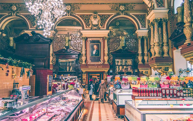 19世紀由聖彼得堡的富豪商人買下,經過大規模的整修搖身一變成為貴族超市,這裡只販售世界各地高檔食品及精選多樣酒款的酒窖。裝潢充滿濃厚新古典主義風格,彩色透光的玻璃裝飾、鍍金的木雕藝術和華麗的大吊燈,滿滿皆是歷史遺產。