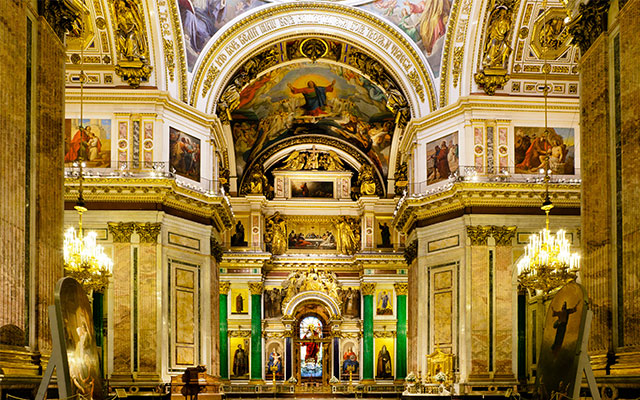 聖彼得堡最大的主教座堂,由沙皇亞歷山大一世下令興建,耗時40年興建而成,是世界四大圓頂教堂之一,但奢華程度位居第一;以希臘十字為結構,中間的穹頂為中心,內部使用了超過400公斤的黃金做裝飾,甚至還用了1000頓的天藍礦石,非常的華麗。