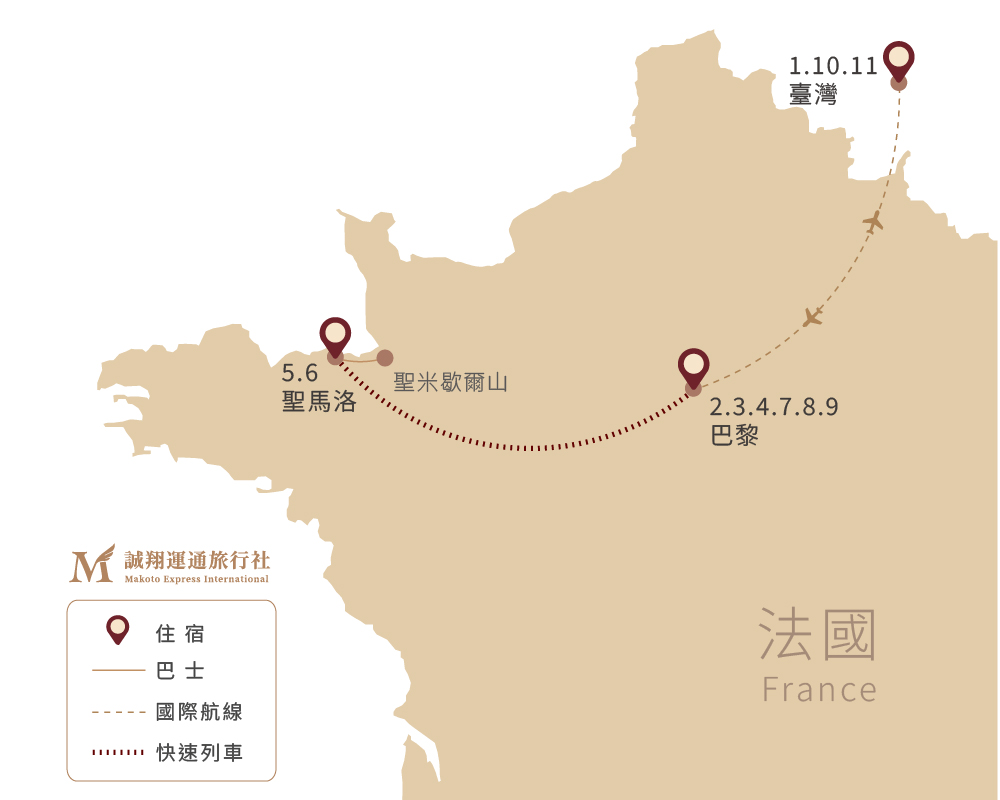 專人相伴自由行,快速火車往返布列塔尼、法國第一奇景聖米歇爾山、巴黎博物館兩日券、巴黎兩日自由活動時光、塞納河遊船晚宴、入住六晚五星、巴黎文華東方連三晚