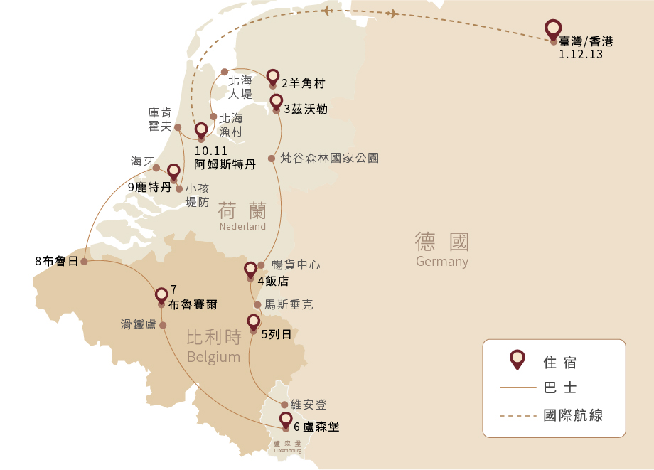 住宿飯店將以鹿特丹、海牙此區為主,行程將以飯店實際落點做順序調整,正確資料請以說明會資料為依據。