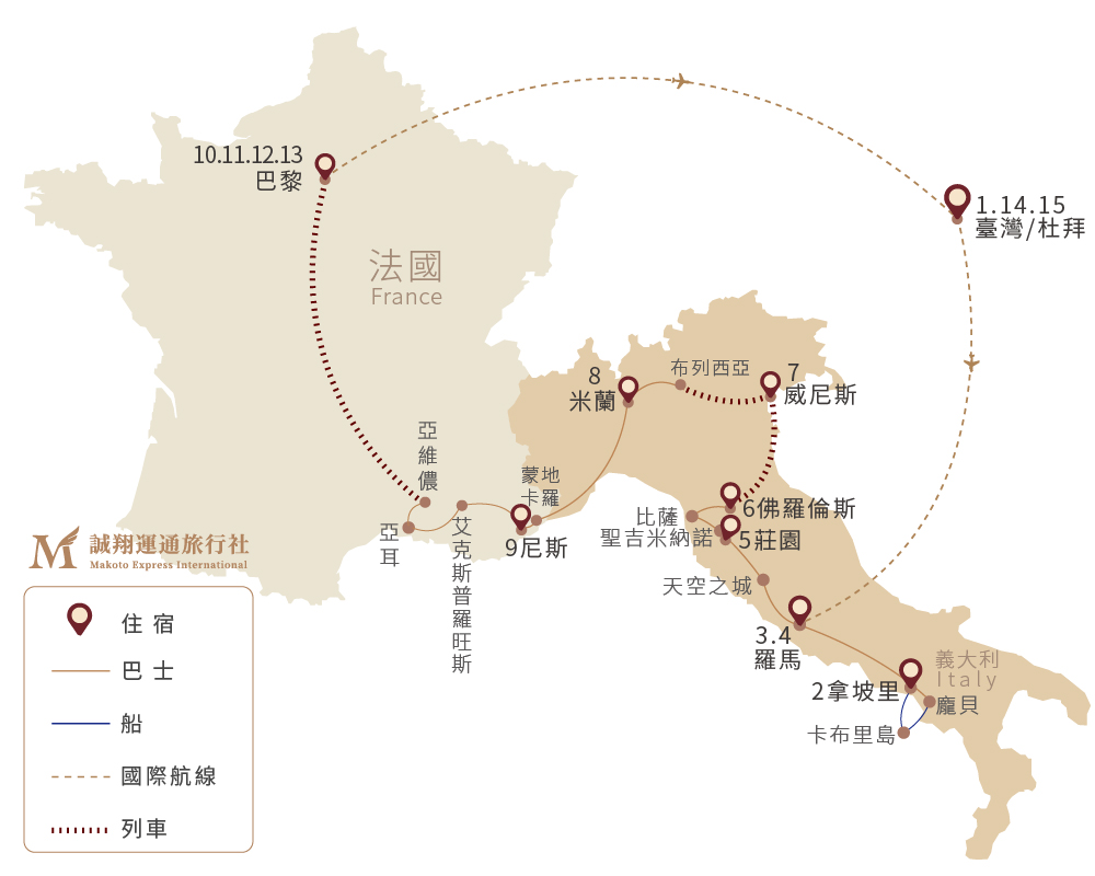 阿聯酋航空雙點進出,巴黎晚班機回多玩一天+三段高速火車優雅旅行、義大利經典四大名城、愛情之都維若納、天空之城秘境、羅馬深度導覽:梵諦岡博物館+競技場、浪漫卡布里島藍洞、法國蔚藍海岸、奢華小國摩納哥、普羅旺斯、巴黎羅浮宮+凡爾賽雙宮、塞納河遊船晚宴、巴黎鐵塔景觀餐廳、主題住宿:羅馬連泊、佛羅倫斯古城、威尼斯島、巴黎五星四晚