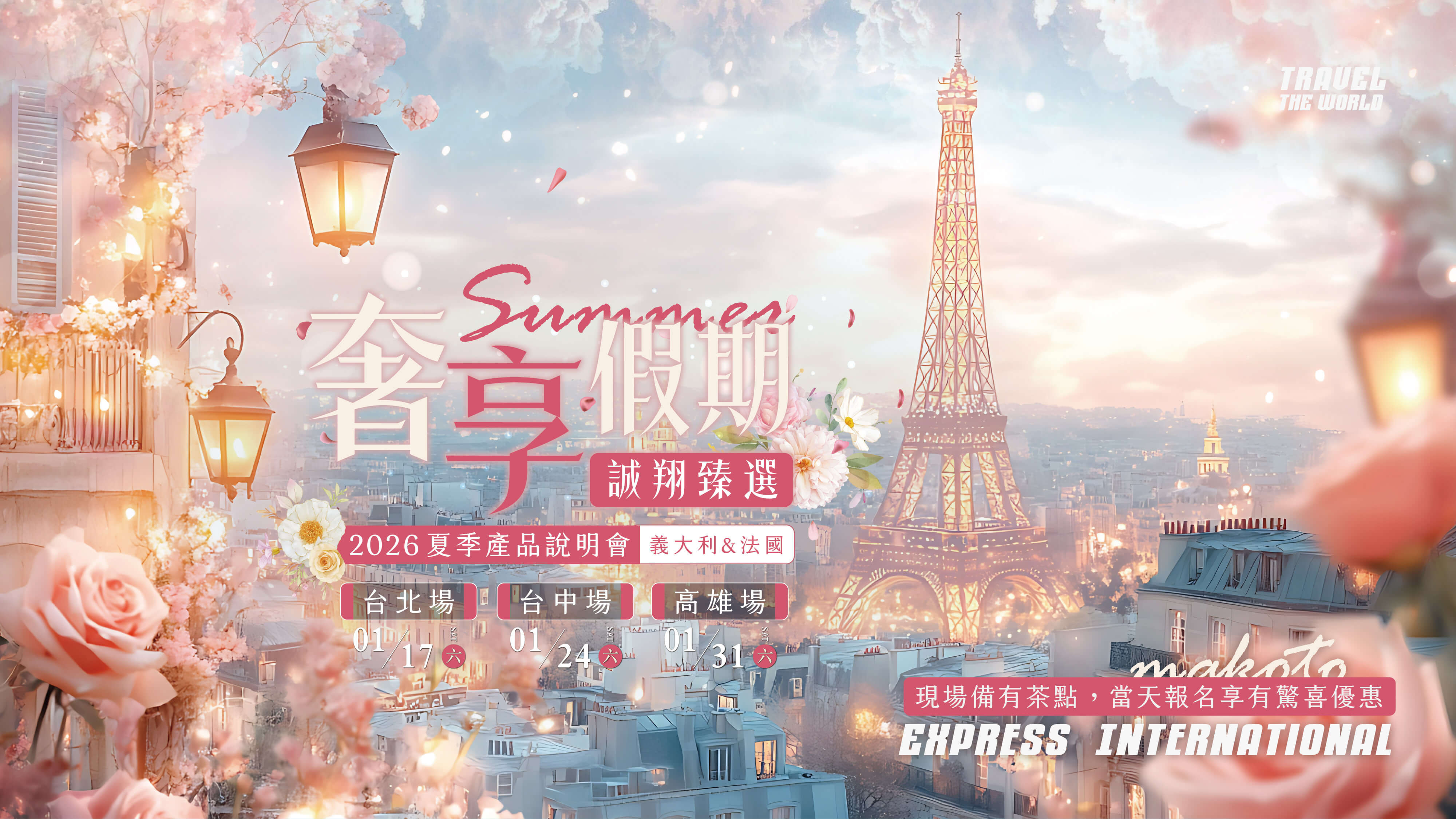 【 2026年01月|夏季旅遊講座|台北場 】 場次資訊 10:30-12:00 13:30-15:00 01/17 (六) 法國/義法 義大利 【 2026年01月|夏季旅遊講座|台中場 】 場次資訊 10:30-12:00 13:30-15:00 01/24 (六) 法國/義法 義大利 【 2026年01月|夏季旅遊講座|高雄場 】 場次資訊 10:30-12:00 13:30-15:00 01/31 (六) 法國/義法 義大利